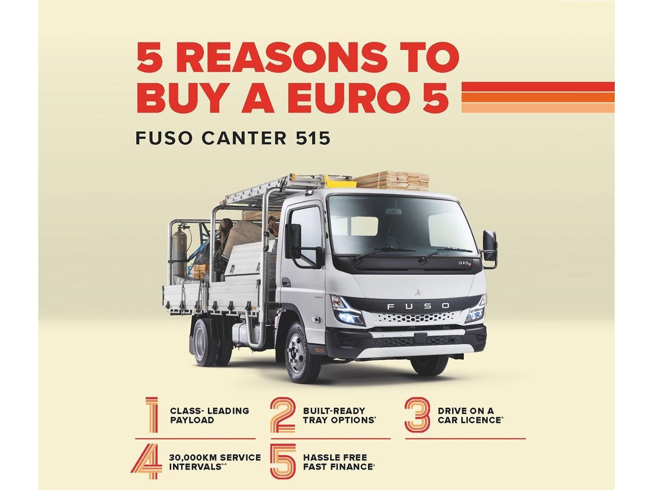 Step up to Fuso's safest Canter ever, now available with a factory-installed 4.5 m aluminium tray and removable ladder racks - engineered to go straight to work.
