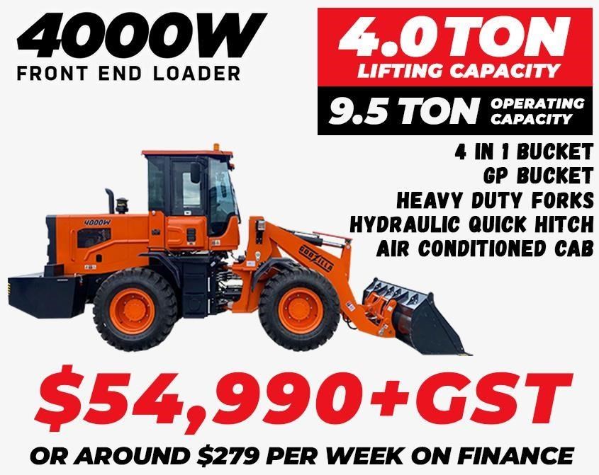 4000W Godzilla Loader - 9.5 Ton Operating Weight, 4 Ton Lifting Capacity, 145 HP Engine From just $54,990+GST or around $279 per week on finance, you can get started with the Massive 4000W today Upgrade to a Cummins Engine for $8,990 + GST, $45 per week on finance 4000W Mulcher Package Upgrade $24,990+GST or around $129 per week finance 4000W Tree Feller Package Upgrade $14,990+GST or around $79 per week finance Do you have a property you need to take care of? Or need to pick up items up to 4 ton with a set of forks? Maybe you have a farm or need to do extra work at the weekends around your property or your business? The 4000w is a proven and reliable choice for your farm or business. Easy to maintain, 4 ton lifting capacity and huge 145 hp. At just $54,990+GST or around $279 per week on finance, it's a cost effective solution for working on your property or farm. If you're interested in looking at the features of the 4000W, watch the detailed video tour of the machine below. Massive 4000W 9.5 ton loader, with 6 cylinder 145 hp engine. Operating Weight - 9500kg / 9.5 ton Load Capacity - 4000 kg / 4 ton Engine - 6 cylinder, 145 HP Dimensions - 7320 (L) x 2480 (W) x 3240mm (H) (+130mm alarm lamp) Includes - GP bucket with 1.5m3 capacity, 4 in 1 bucket, heavy duty forks, hydraulic quick release hitch Air Conditioned Cab - for the summer, heated for the winter Warranty - 24 months manufacturer's warranty Delivery - Australia wide delivery available Easy to apply, no deposit and financing available- The Godzilla Loaders 4000W from just $279 per week, all done via experienced finance teams that search for the best deal for you. From the first day you own your new loader, no dodgy overpriced rent-to-own options Bucket and Arm Safety Lock - keep safe whilst you're working with our additional safety features Parking Brake - another safety feature that comes as standard with all Godzilla Loader models Lighting Package - includes warning light, front and rear turning light, rear width light Reverse Buzzer - alerts other workers and allows them to move out of the way whilst you're reversing Key Stop Engine - for the security of your machine when left on site Large Alloy Radiator with Cooling Fan - efficient cooling of engine and hydraulic oil Hydraulic Oil Cooler - this means it keeps oil temp lower allowing you to operate longer with no issues Auxiliary Hydraulic Outputs - this means you can add many options of external accessories to your Godzilla Loaders 4000W loader Hose Coupler Fittings - this means it eliminates the chance of dirt and other foreign objects getting into your Godzilla Loaders 4000W loader Quick Release Attachment Mounting Plate - you can buy attachments anywhere you like for your Godzilla Loaders 4000W loader or use ones you may have already Gauges and Warning Lights - these gauges point out if there are any issues, meaning you can stop the machine and rectify before any damage is caused allowing your Godzilla Loaders 4000W loader machine a long and reliable service life. Service Kit and Tools - included free is a tool box and service kit so you wont have to go digging for tools if you need to service or adjust something on your Godzilla Loaders 4000W loader Engine Access Panel Hinged - this gives you easy access to all your components of your Godzilla Loaders 4000W loader Tie Down Locations - safe security for transporting for your Godzilla Loaders 4000W loader Emergency Stop Switch - quick and easy to hit in case of any issues while operating the machine; all standard on the Godzilla Loaders 4000W loader Lift Hook Locations - if you have to lift your machine on to a site via a crane etc it can be done easily without any risk to your Godzilla Loaders 4000W loader Lift Arm Safety Support - this means you are safe when using your Godzilla Loaders 4000W loader SUPER heavy duty, economical and reliable. The 4000W could be exactly what you're looking for.
